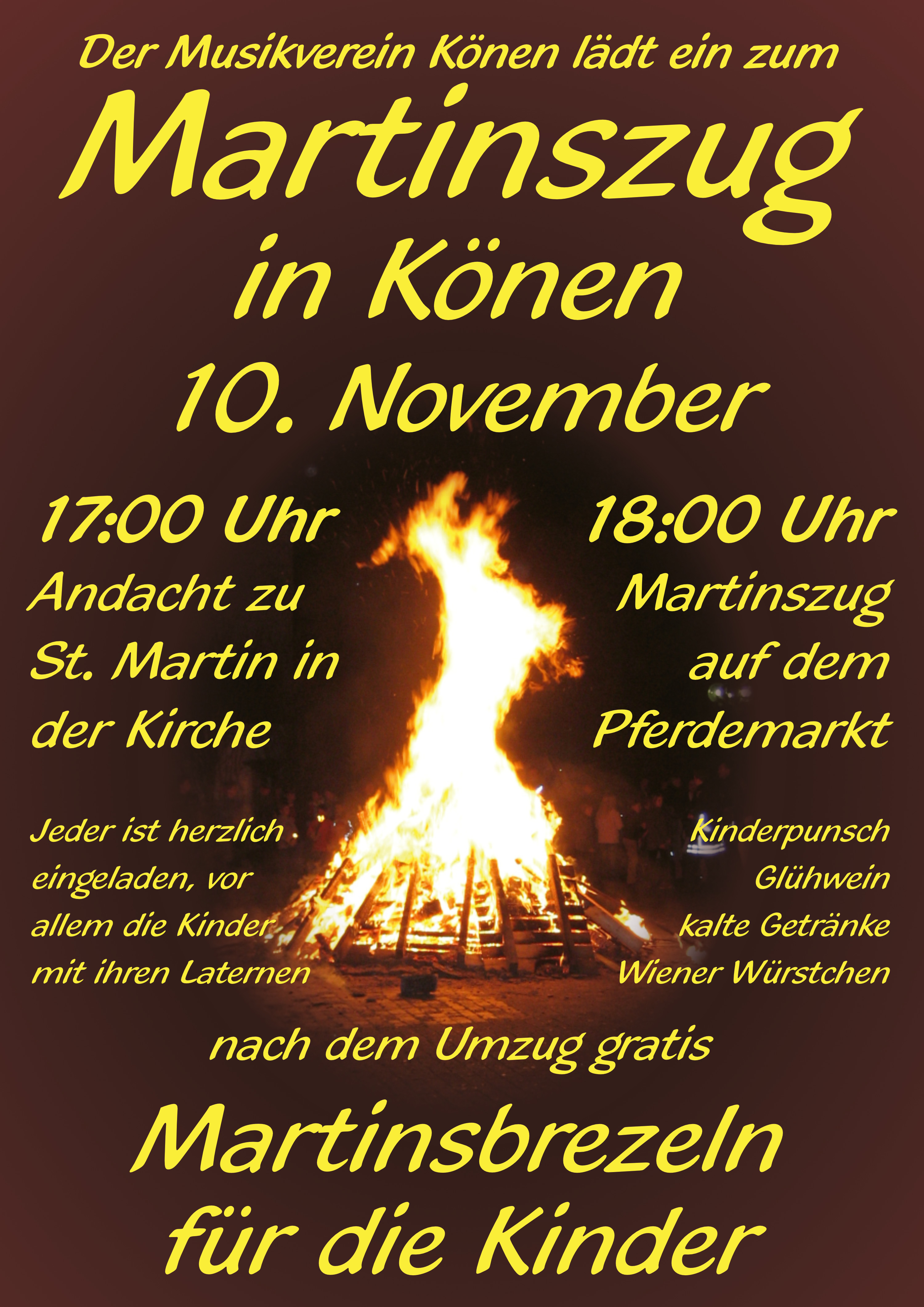 Start des Martinszugs ist um 18:00 Uhr auf dem Pferdemarkt. Unter den Klängen des Musikvereins und begleitet von der Freiwilligen Feuerwehr, den Könener Bürgern und Kindern mit ihren Laternen reitet Sankt Martin vom Pferdemarkt über die Saarburger Straße, Reiniger Straße und Hohlweg zurück zum Pferdemarkt, wo ein großes Martinsfeuer entzündet wird.Nach dem Umzug werden Martinsbrezeln an die Kinder verteilt.
